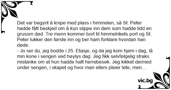 Det var begynt å knipe med plass i himmelen, så St. Peter hadde fått beskjed om å kun slippe inn dem som hadde lidd en grusom død. Tre menn kommer bort til himmelrikets port og St. Peter lukker den første inn og ber ham forklare hvordan han døde.