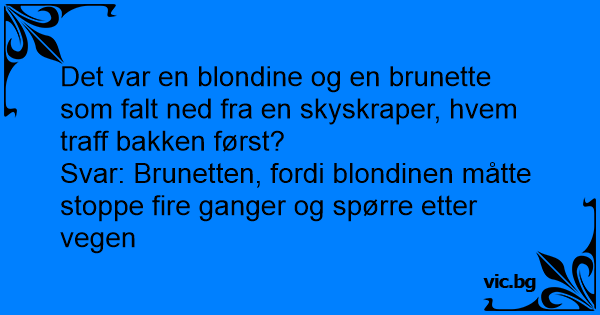 En brunette og en blondine hopper ut fra et fly. Hvem lander først, og hvorfor? Svar: Brunetta lander først, fordi blondina stopper 5 ganger for å spørre om veien.