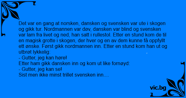 Det var en engelsman, en tysk och en norrman. Engelsmannen var blind, tysken var stum och norrmannen var lam och satt i rullstol. En dag när de var ute och gick i skogen kom de till en grotta, och...