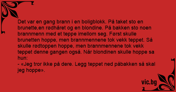 Det var en gang brann i en boligblokk. På taket sto en brunette,en rødhåret og en blondine. På bakken sto noen brannmenn med et teppe imellom seg. Først skulle brunetten hoppe, men brannmennene tok vekk teppet. Så skulle rødtoppen hoppe, men brannmennene tok vekk teppet denne gangen også. Når blondinen skulle hoppe sa hun: