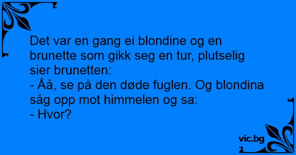 Мртва птица Watch the Birdie Eine Brünette und eine Blondine Το πεθαμένο πουλάκι Блондинка и брюнетка се разхождат в парка. Ein Ostfriese ist in Bayern im Urlaub. Идут 2 блондинки. Одна и говорит: Una pareja de gallegos caminaba por la playa y en eso que le dice el hombre a su mujer: One day, a blonde and her friend were walking through the park. Suddenly, the blonde's friend said, "Oh, look, a dead birdie!" The blonde looked up and said, "Where?" Eine Brünette und eine Blondine gehen durch einen Park. Plötzlich sagt die Brünette: "Kuck mal, ein toter Vogel". Die Blondine sieht zum Himmel und fragt: "Wo?" Uma morena e uma loira estavam passeando. A morena disse: - Veja, um passarinho morto! A loira olhou pra cima e perguntou: - Onde? C'est une brune qui dit à une blonde : "Ho, un oiseau mort!!" Et puis la blonde regarde vers le ciel et dit : "Ou ça ????" Idą dwie blondynki przez park. Jedna mówi do drugiej: - Patrz, zdechły ptaszek. A druga patrzy w niebo i mówi: - Gdzie? En brunette och en blondin var ute och promenerade när brunetten plötsligt utbrister: - åhhh, titta en död fågel Varvid blondinen stannar och stirrar upp i lufte... Ce sont deux amis, un francais et un belge qui se promenent sur la plage.Soudain, le francais dit au belge: 'regarde une mouette morte! ou ça?'dit le belge en regardant en l'air... Un lepero le dice a otro: Oye Paco... mira mira, un pájaro muerto!! Paco mira hacia el cielo y pregunta... ¿dónde dónde? Une brune et une blonde se balade en ville.Soudain la brune crie : - AAAAH UN PIGEON MORT !!!! La blonde regarde dans le ciel et dis : - OU ÇA,OU ÇA !!!!! Dos atlantes se encuentran en la playa y uno de ellos le dice al otro: - Mira, una gaviota muerta. Y el otro mirando hacia el cielo le pregunta: - ¿Dónde? Deux blondes se promènent en forêt. L'une dit : "Oh, regarde, des oiseaux morts !" L'autre regarde en l'air et fait : "où ça ?". Op straat loopt een dom blondje en een brunette. De brunette roept: “Kijk een dood vogeltje!” Waarop het domme blondje omhoog kijkt en zegt: “Waar dan?” En brunette og en blondine kommer gående, og brunetten sier: - Se, der er en død fugl. Blondinen kikker opp og sier: - Hvor? Det var en gang to svensker som gikk på en vei så sa den ene: Titta, en död fågel. Da ser den andre svensken opp i lufta og sier: Var da? En blondine og en brunette går en tur i parken. Pludselig siger brunetten: Ad! Prøv at se på den døde fugl! – Blondinen stopper, kigger op og siger: Hvor? Uma loira e uma morena, estavam passeando pela calçada, quando de repente a morena falou: - Olha um passarinho morto! Então a loira olhou para cima e disse: - Onde? Come si misura l’intelligenza di una bionda ? Le si infila un manometro in un orecchio. Perche’ la bionda ha attraversato la strada ?- Dimenticati la strada…. cosa stava facendo fuori dalla... Iemand zegt tegen een Limburger: "Kijk daar een dode vogel!" Waarop de Limburger naar de lucht kijkt en vraagt: "Waar dan?" O blonda si o bruneta se plimbau in parcul Cismigiu. Bruneta : - Uite o pasare moarta! La care blonda ,uitandu-se pe cer ,spune : - Unde ,unde?? Memento mori To blondiner går tur på stranden. Pludselig siger den ene: "Guuuud, se en død måge!" "Hvor?" Siger den anden, mens hun kigger op luften. Blondi ja brunette kävelevät puistossa. - Katso! Kuollut lintu! sanoo brunette Blondi katsoo ylös ja kysyy: - Missä? O bruneta se adreseaza unei blonde: - Uite, draga, o pasare moarta... - Unde, unde, unde? intreaba blonda privind spre cer! Deux blonde se promènent, soudainement ; l'une s'écrit : - Oh ! Regarde un oiseau mort ! - Où ça ?! Demande l'autre en regardant le ciel. A brunette says to a blonde "Look! A dead bird!" and the blonde looks up and says "Where?" Ei brunette og ei blondine var ute og gikk en tur i parken sammen. Plutselig ser brunetten en død fugl på bakken og sier "å se på den stakkars døde fuglen". Blondinen kikker opp i lufta og sier... Une blonde se promène avec une amie. Soudain, celle-ci lui dit : - Oh, regarde ! Un oiseau mort ! La blonde lève alors la tête : - Où ça ? Où ça ? Une blonde et son amie(qui n'est pas blonde) se promènent dans un parc. Plus tard son amie dit : - «Regarde un oiseau mort!» Et la blonde lui répond en levant sa tête : - «Où ça» Død fugl En blondine og hendes kæreste var ude og gå en tur. Pludselig udbryder manden: - Ad, prøv at se den døde fugl der!!! Hvorefter blondinen kigger op og siger: - Hvor. Blondinen og brunetten En blondine og en brunette kom gående.... Lige pludselig siger brunetten: "SE! der ligger en død fugl" . Blondinen kigger op i himlen og siger: "Hvor, hvor!".... Brunetka i blondynka idą przez park. Brunetka nagle mówi: "Och, popatrz na tego biednego zdechłego ptaszka!" Blondynka spojrzała na niebo i spytała "Gdzie?" O blonda si o Bruneta stau pe o banca in parc. - Uite o Pasare moarta, zice bruneta. - Unde? zice blonda, Uitandu-se pe cer. A brunette and a blonde are walking along in a park one morning. Suddenly, the brunette notices a dead bird. "Awww, look at the dead birdie," she says sadly. The blonde stops, looks up into the... Birgün dagda Temel ile Cemal yürürken Temel Cemal’e derki: - "Yahu Cemal paksana, kus ölmüs daa!" Cemal de havaya bakarak cevap verir: - "Ula Temel hanidur daa??"
