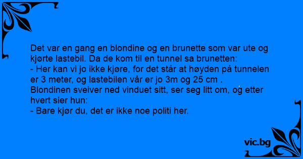 Det var en gang en blondine og en brunette som var ute og kjørte lastebil. Da de kom til en tunnel sa brunetten: