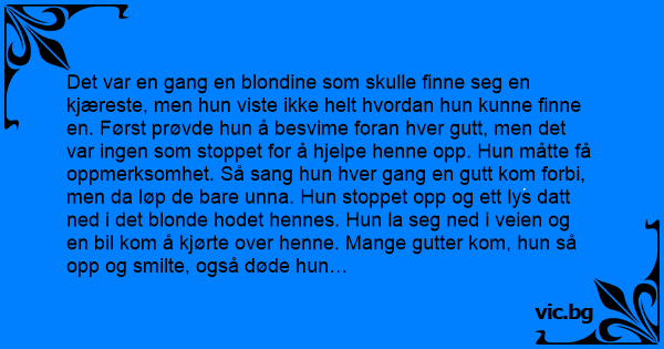 Det var en gang en blondine som skulle finne seg en kjæreste, men hun viste ikke helt hvordan hun kunne finne en. Først prøvde hun å besvime foran hver gutt, men det var ingen som stoppet for å hjelpe henne opp. Нun måtte få oppmerksomhet. Så sang hun hver gang en gutt kom forbi, men da løp de bare unna. Нun stoppet opp og ett lys datt ned i det blonde hodet hennes. Нun la seg ned i veien og en bil kom å kjørte over henne. Mange gutter kom, hun så opp og smilte, også døde hun…