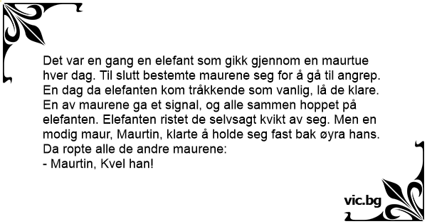 Det var en gang en elefant som gikk gjennom en maurtue hver dag. Til slutt bestemte maurene seg for å gå til angrep. En dag da elefanten kom tråkkende som vanlig, lå de klare. En av maurene ga et signal, og alle sammen hoppet på elefanten. Elefanten ristet de selvsagt kvikt av seg. Men en modig maur, Maurtin, klarte å holde seg fast bak øyra hans. Da ropte alle de andre maurene: