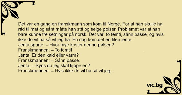 Det var en gang en franskmann som kom til Norge. For at han skulle ha råd til mat og sånt måtte han stå og selge pølser. Problemet var at han bare kunne tre setningar på norsk. Det var: to femti, sånn passe, og hvis ikke do vil ha så vil jeg ha. En dag kom det en liten jente.