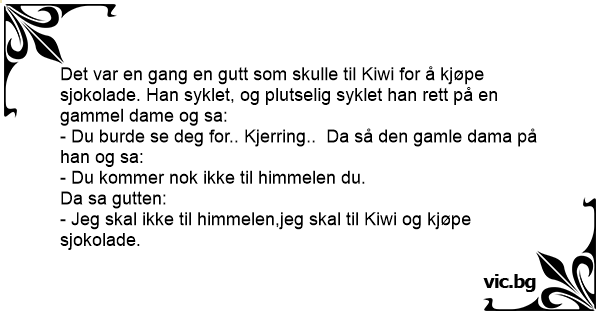 Det var en gang en gutt som skulle til Kiwi for å kjøpe sjokolade. Han syklet, og plutselig syklet han rett på en gammel dame og sa: