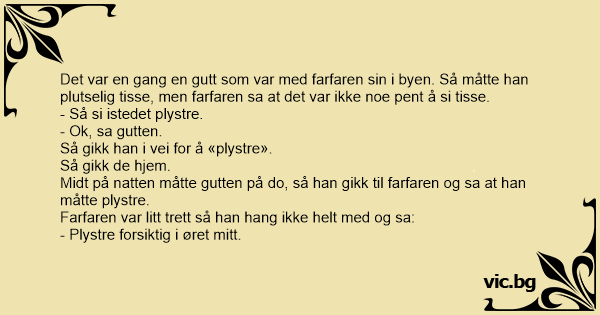 Det var en gang en gutt som var med farfaren sin i byen. Så måtte han plutselig tisse, men farfaren sa at det var ikke noe pent å si tisse.