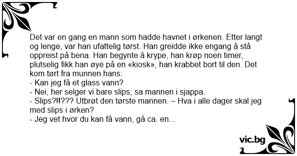 - Slips?!!??? Utbrøt den tørste mannen. – Hva i alle dager skal jeg med slips i ørken?