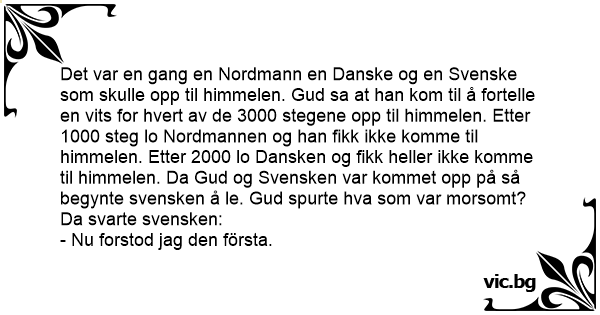 Det var en gang en Nordmann en Danske og en Svenske som skulle opp til himmelen. Gud sa at han kom til å fortelle en vits for hvert av de 3000 stegene opp til himmelen. Etter 1000 steg lo Nordmannen og han fikk ikke komme til himmelen. Etter 2000 lo Dansken og fikk heller ikke komme til himmelen. Da Gud og Svensken var kommet opp på så begynte svensken å le. Gud spurte hva som var morsomt? Da svarte svensken: