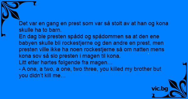En dag ble presten spådd og spådommen sa at den ene babyen skulle bli rockestjerne og den andre en prest, men presten ville ikke ha noen rockestjerne så om natten mens kona sov så slo presten i magen til kona.