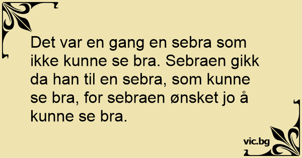 Det var en gang en sebra som ikke kunne se вrа. Sebraen gikk da han til en sebra, som kunne se вrа, for sebraen ønsket jo å kunne se вrа.