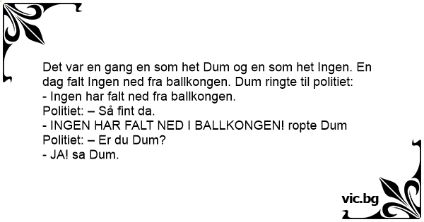 Det var en gang en som het Dum og en som het Ingen. En dag falt Ingen ned fra ballkongen. Dum ringte til politiet: