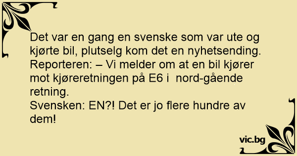 En mann satt bilen sin på veg til Oslo. Han skrudde på radioen, og hørte trafikkmeldingen: - Alle de som kjører opp mot Trøndelag må være forsiktige. Det er en mann som kjører i feil fil - En!...