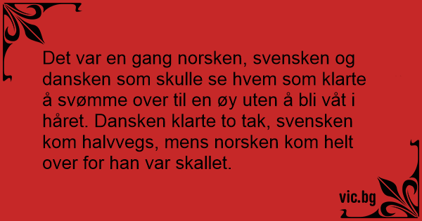 Det var en gang norsken, svensken og dansken som skulle se hvem som klarte å svømme over til en øy uten å bli våt i håret. Dansken klarte to tak, svensken kom halvvegs, mens norsken kom helt over for han var skallet.