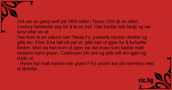 Μια μέρα, ένας καουμπόη, μπαίνει νευριασμένος σ` ένα σαλούν και φωνάζει: - "Ποιος έβαψε το άλογό μου πράσινο;" Δεν παίρνει απάντηση, και ξαναρωτάει: - "Ποιος έβαψε το άλογό μου πράσινο;" Σηκώνεται...