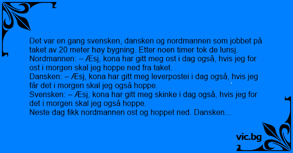 Det var en gang svensken, dansken og nordmannen som jobbet på taket av 20 meter høy bygning. Etter noen timer tok de lunsj.