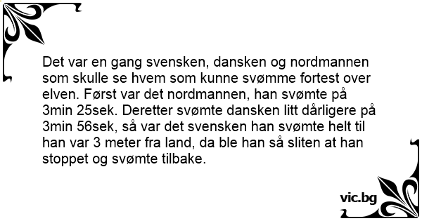 Det var en gang svensken, dansken og nordmannen som skulle se hvem som kunne svømme fortest over elven. Først var det nordmannen, han svømte på 3min 25sek. Deretter svømte dansken litt dårligere på 3min 56sek, så var det svensken han svømte helt til han var 3 meter fra land, da ble han så sliten at han stoppet og svømte tilbake.