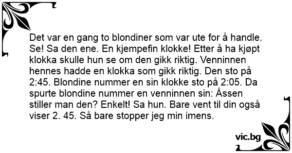 Det var en gang to blondiner som var ute for å handle. Se! Sa den ene. En kjempefin klokke! Etter å ha kjøpt klokka skulle hun se om den gikk riktig. Venninnen hennes hadde en klokka som gikk riktig. Den sto på 2:45. Blondine nummer en sin klokke sto på 2:05. Da spurte blondine nummer en venninnen sin: Åssen stiller man den? Enkelt! Sa hun. Bare vent til din også viser 2. 45. Så bare stopper jeg min imens.