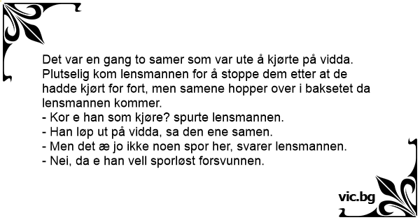 Det var en gang to samer som var ute å kjørte på vidda. Plutselig kom lensmannen for å stoppe dem etter at de hadde kjørt for fort, men samene hopper over i baksetet da lensmannen kommer.