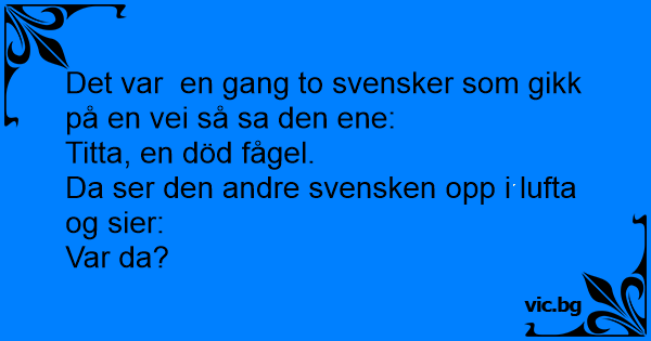 Det var en gang ei blondine og en brunette som gikk seg en tur, plutselig sier brunetten: – Åå, se på den døde fuglen. Og blondina såg opp mot himmelen og sa: – Hvor?