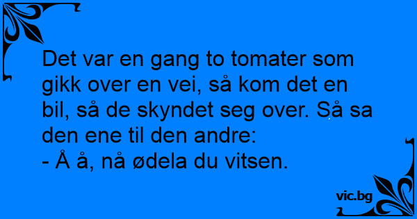 Det var en gang to tomater som gikk over en vei, så kom det en bil, så de skyndet seg over. Så sa den ene til den andre: