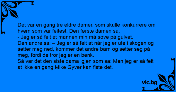 Det var en gang tre eldre damer, som skulle konkurrere om hvem som var feitest. Den første damen sa: - Jeg er så feit at mannen min må sove på gulvet. Den andre sa: – Jeg er så feit at når jeg er ute i skogen og setter meg ned, kommer det andre barn og setter seg på meg, fordi de tror jeg er en benk. Så var det den siste dama igjen som sa: Men jeg er så feit at ikke en gang Mike Gyver kan fiste det.