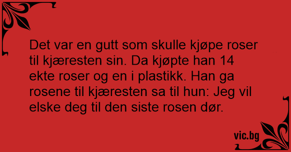 Det var en gutt som skulle kjøpe roser til kjæresten sin. Da kjøpte han 14 ekte roser og en i plastikk. Han ga rosene til kjæresten sa til hun: Jeg vil elske deg til den siste rosen dør.