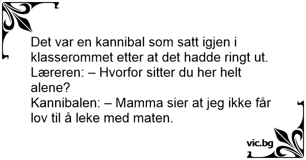 Un enfant cannibale est seul dans la cours de récréation. La maitresse lui demande pourquoi il ne vas pas avec les autres enfants Детенце-канибал си играе само на площадката. Учителя отива и го пита: - Защо не играеш с другите деца?! - Мама не ми дава да си играя с храната. C'est un enfant de parents cannibale qui est à l'école, assis tout seul dans son coin. La maîtresse arrive et demande : Pourquoi tu ne vas pas jouer avec les autres ? Le petit cannibale répond : Mes parents m'ont toujours interdit de jouer avec la nourriture. Har du hørt om kannibal gutten som ikke ville leke med de andre barna på skolen? - Han fikk ikke lov av moren til å leke med maten.... En kannibal gutt satt på trappen utenfor skolen, da kom læreren og sa: – Hvorfor leker du ikke med de andre barna? Kannibalen: – Fordi mamma og pappa sier jeg ikke får leke med maten. hvorfor har kannibal børn ingen venner? – fordi man ikke må lege med maden Hva sier kanibalmoren når barna hennes leker sisten med misjonærbarna? - «Ikke lek med maten!» Un enfant cannibale reste toujours dans un coin. Sa maîtresse va le voir et lui demande : - Mais pourquoi tu ne vas pas avec les autres enfants ? - Parce que mon père m'a dit de ne pas jouer avec... Pourquoi un enfant cannibale n'a pas le droit de jouer avec un autre enfant ? Car on ne  joue pas avec la nourriture !