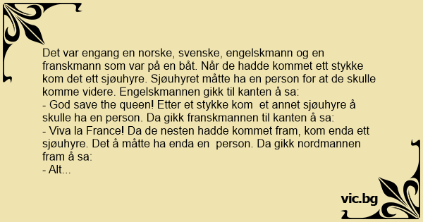 Det var engang en norske, svenske, engelskmann og en franskmann som var på en båt. Når de hadde kommet ett stykke kom det ett sjøuhyre. Sjøuhyret måtte ha en person for at de skulle komme videre. Engelskmannen gikk til kanten å sa: