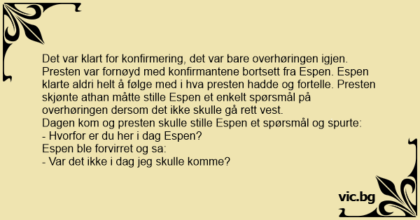 Det var klart for konfirmering, det var bare overhøringen igjen. Presten var fornøyd med konfirmantene bortsett fra Espen. Espen klarte aldri helt å følge med i hva presten hadde og fortelle. Presten skjønte athan måtte stille Espen et enkelt spørsmål på overhøringen dersom det ikke skulle gå rett vest.
