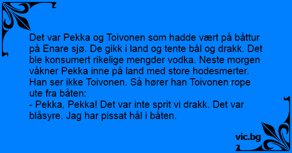 - Pekka, Pekka! Det var inte sprit vi drakk. Det var blåsyre. Jag har pissat hål i båten.