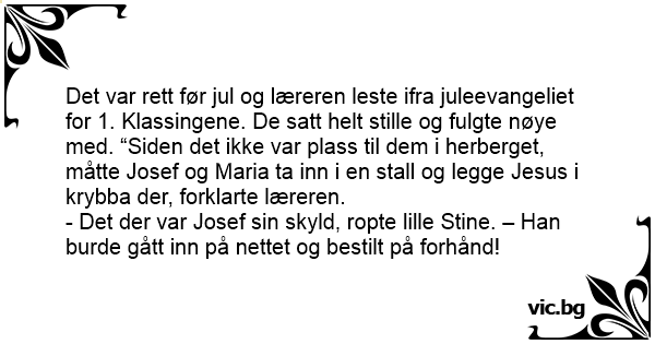 Det var rett før jul og læreren leste ifra juleevangeliet for 1. Klassingene. De satt helt stille og fulgte nøye med. “Siden det ikke var plass til dem i herberget, måtte Josef og Maria ta inn i en stall og legge Jesus i krybba der, forklarte læreren.