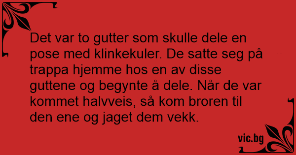 Det var to gutter som skulle dele en pose med klinkekuler. De satte seg på trappa hjemme hos en av disse guttene og begynte å dele. Når de var kommet halvveis, så kom broren til den ene og jaget dem vekk.