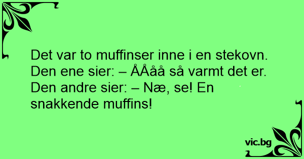 Der sad 2 muffins i en ovn. - Den ene muffin sagde “Nej hvor er der varmt herinde.” - Så råbte den anden “Ahhhh en talende muffin.”