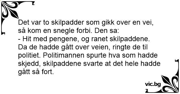 Det var to skilpadder som gikk over en vei, så kom en snegle forbi. Den sa: