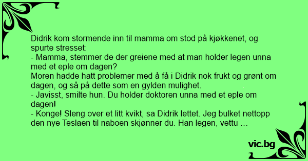 - Mamma, stemmer de der greiene med at man holder legen unna med et eple om dagen?