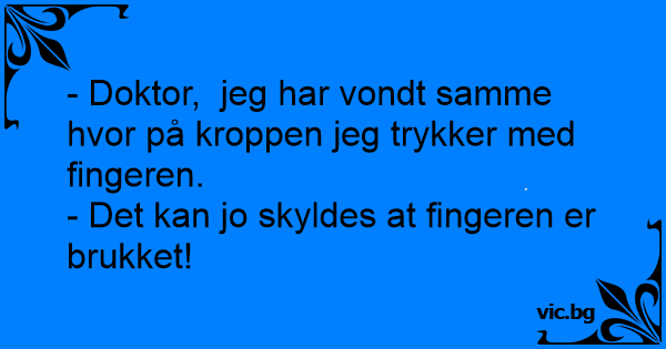 En mann gikk til legen og sa: – Jeg har vondt over alt, når jeg tar på armen, på beinet, i ansiktet. Legen så på mannen og sa: – Du har jo sår på fingeren.