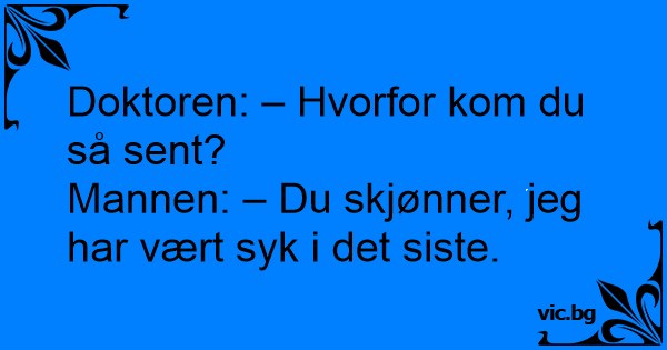 Doktoren til pasienten. - Hvorfor kom du ikke til timen? Pasienten. - Beklager doktor, men jeg har vært syk!