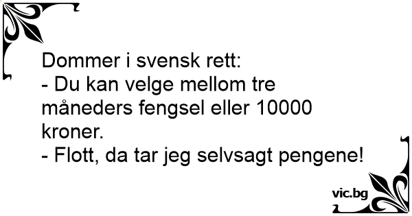 - Domaren till norrmannen: - Ni får välja mellan böter och fängelse. Vill ni ha 3.000 kronor eller tio dagar fängelse? Norrmannen: - Solklart, jag tar pengarna.