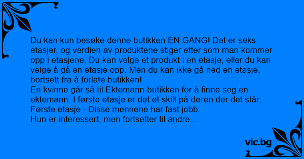 Sjette etasje - Du er besøkende nummer 31.456.012 i denne etasjen. Det er ingen menn i denne etasjen. Denne etasjen eksisterer kun som bevis på at det er umulig å tilfredsstille kvinner. Takk for at du besøkte Ektemann-butikken.