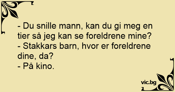 - Du snille mann, kan du gi meg en tier så jeg kan se foreldrene mine?<br />- Stakkars barn, hvor er foreldrene dine, da?<br />- På kino.