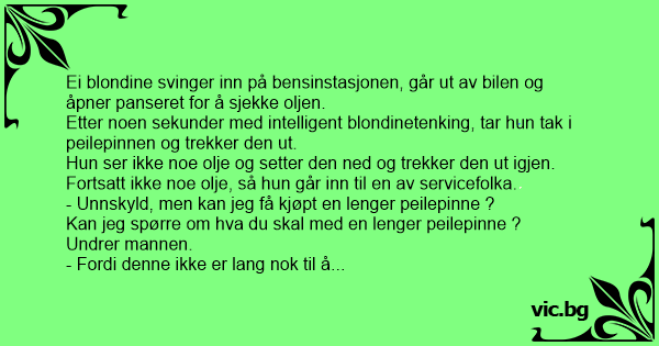Ei blondine svinger inn på bensinstasjonen, går ut av bilen og åpner panseret for å sjekke oljen.