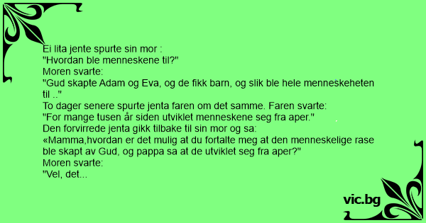 «Mamma,hvordan er det mulig at du fortalte meg at den menneskelige rase ble skapt av Gud, og pappa sa at de utviklet seg fra aper?"