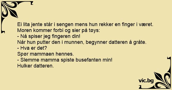 Ei lita jente står i sengen mens hun rekker en finger i været. Moren kommer forbi og sier på tøys: