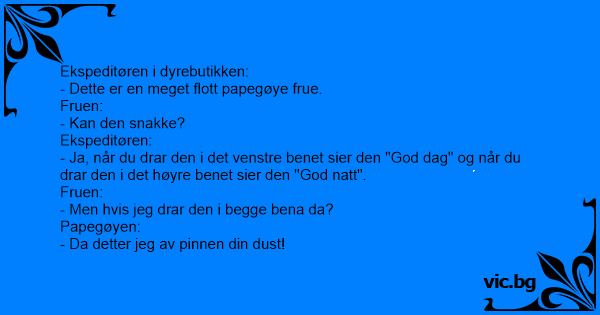 Der var en gang en mand der ville have en papegøje, men den skulle osse kunne snakke. Derfor gik han ned til dyrehandleren og sgade at han skulle have en papegøje der kunne snakke. - Nåh, sagde...
