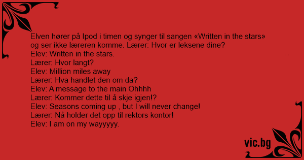 Elven hører på Ipod i timen og synger til sangen «Written in the stars» og ser ikke læreren komme. Lærer: Hvor er leksene dine?
