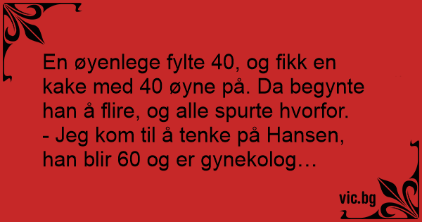 En øyenlege fylte 40, og fikk en kake med 40 øyne på. Da begynte han å flire, og alle spurte hvorfor.