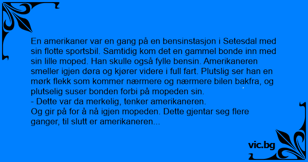 En amerikaner var en gang på en bensinstasjon i Setesdal med sin flotte sportsbil. Samtidig kom det en gammel bonde inn med sin lille moped. Han skulle også fylle bensin. Amerikaneren smeller igjen døra og kjører videre i full fаrт. Plutslig ser han en mørk flekk som kommer nærmere og nærmere bilen bakfra, og plutselig suser bonden forbi på mopeden sin.