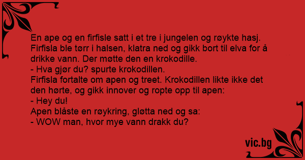 En ape og en firfisle satt i et tre i jungelen og røykte hasj. Firfisla ble tørr i halsen, klatra ned og gikk bort til elva for å drikke vann. Der møtte den en krokodille.