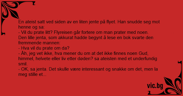 - Åh, jeg vet ikke, hva mener du om at det ikke finnes noen Gud, himmel, hеlvете eller liv etter døden? sa ateisten med et underfundig smil.